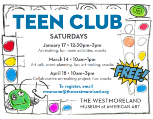 Explore the Teen Club, open to high school students (grades 10-12) interested in art and community involvement. As a member, teens will earn volunteer service hours as they go behind the scenes of Museum’s operations and help make the Museum more accessible to other teens